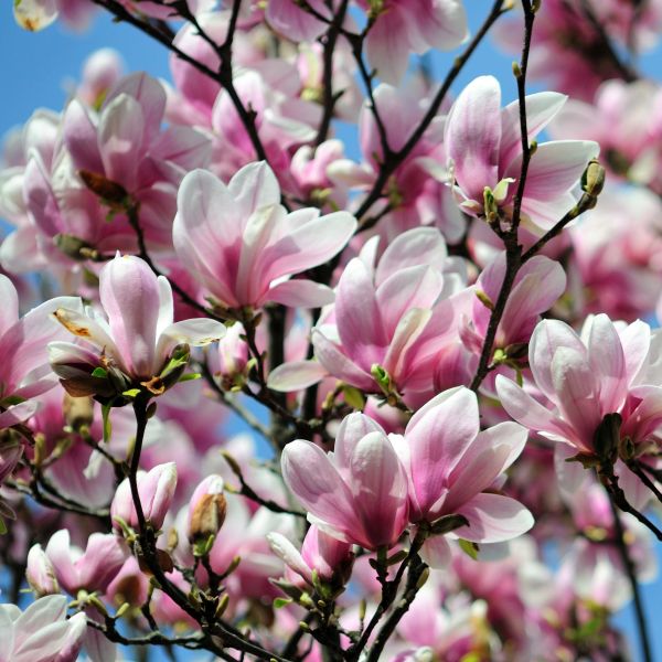 This selection of Saucer Magnolia was chosen specifically for its wonderful, dark-purple flower buds, and huge cup-shaped flowers with light pink and white interiors. The massive flower display is phenomenal.