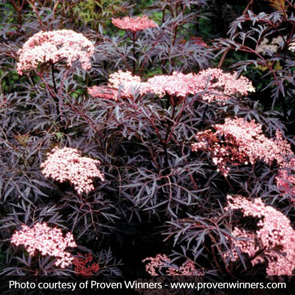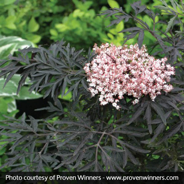 The exciting Black Lace® Elderberry (Sambucus nigra ‘Eva’ P.P.) takes the traditional notion of a rangy old, plain Jane Elderberry and throws it out the window. With dark purple-red, deeply dissected foliage and a fragrant light pink bloom, this glamorous variety rewrites the way we can use the Elderberry in the landscape!
