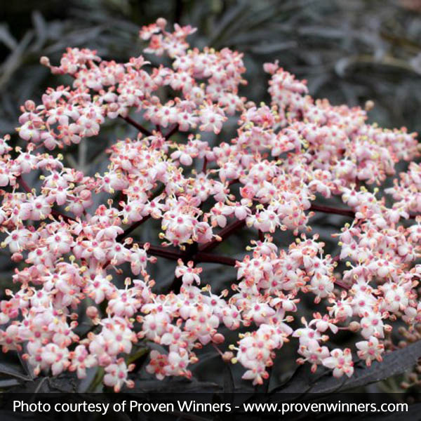 Young stems are purple, and gradually become a grey-brown as they age. The light pink flowers are exquisitely visible, floating on top of the dark foliage of the Black Lace Elderberry.
