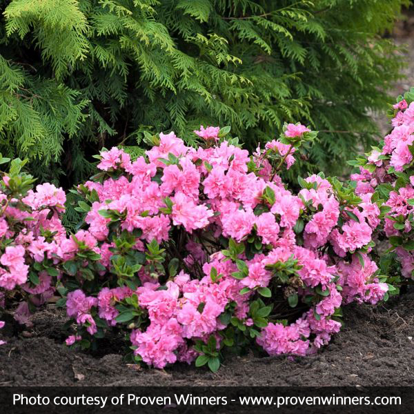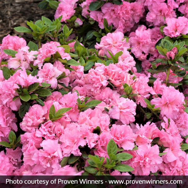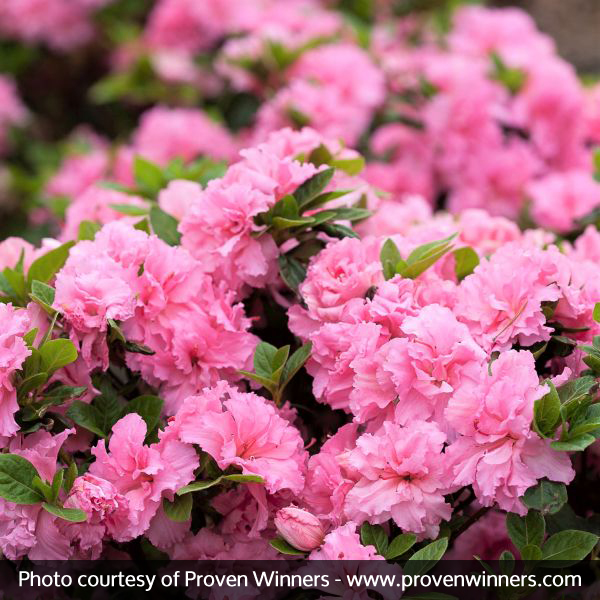 Bloom-A-Thon Pink Double Azaleas have a glossy dense, bushy and vigorous growth habit; perfect for mass plantings, mixed borders, containers, foundation plantings or as specimen plants.