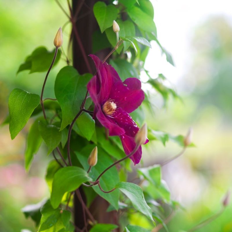 Groom this plant after first flowering by cutting back the top one-third to one-half of some stems. Clematis Bourbon is a very reliable performer once established; it takes a season or two to get going.