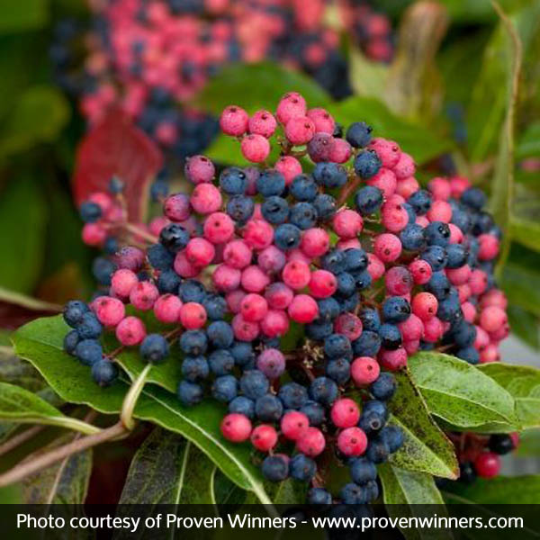 Brandywine Viburnum presents one of the most spectacular displays of autumn color available. The pink and blue berries alone set it apart as a uniquely beautiful shrub. However, when you consider Brandywine Viburnum’s spring flowers, form, colorful foliage, deer resistance and hardy nature—it’s easy to see that this phenomenal shrub is a must-have for almost any landscape.
