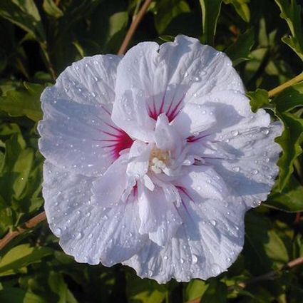 The Althea ‘China Chiffon’, Hibiscus syriacus ‘Bricutts’, produces large, single white flowers that are adorned with a red eye and a lacy center to create an anemone-like flower; performs even in cooler climates.