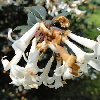 Delavay Osmanthus is a great evergreen for your garden in zones 7-9 and makes a smashing background for your mixed border or foundation planting. It has as outstanding jasmine-like scent that needs to be near windows and walkways for enjoyment. It grows dense enough that it can even be sheered for topiaries and formal clipped hedges. The branches are also highly prized in upscale florists displays for their beauty and fragrance.