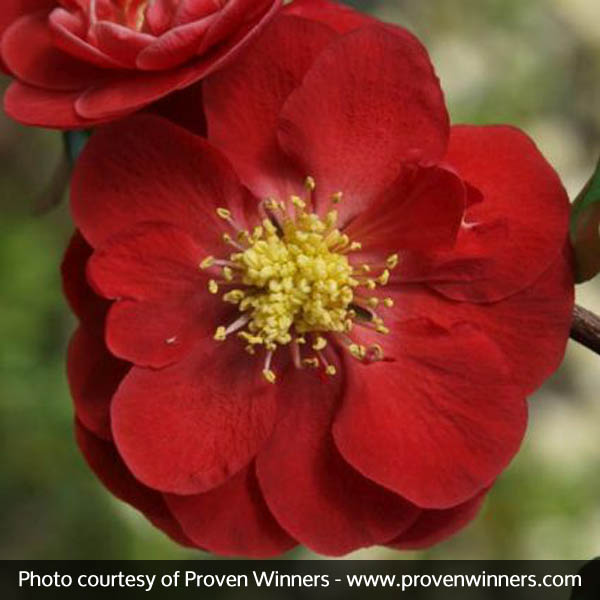 Double Take Scarlet™ Quince (Chaenomeles speciosa ‘Scarlet Storm’) is an improved variety that works beautifully many places around your landscape. This variety features amazing, double dark red flowers that absolutely cover the stems from top to bottom.