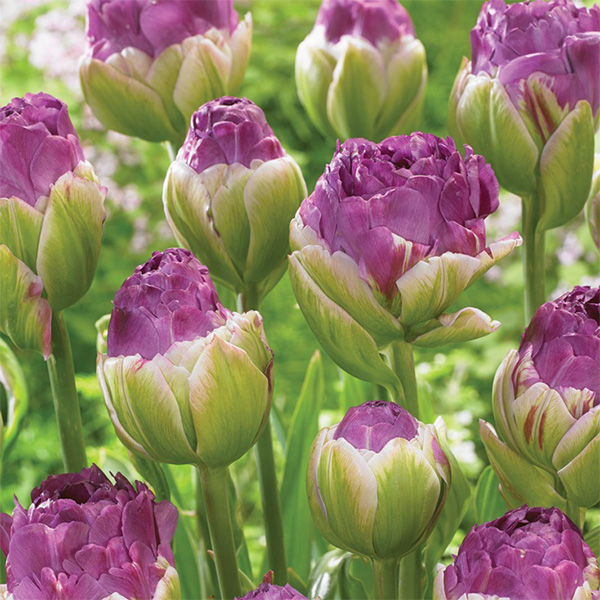 The Exquisit Tulip draws in the eye and holds your gaze. With its grape-colored center petals and variegated green and white outer petals, this stunning flower demands to be studied up-close and appreciated from a distance. As a bi-color double, its beauty multiplies as this tulip’s bud begins to open. Its appearance transforms from day to day as the creamy-white and green petals open and the bright purple plume of petals emerges.