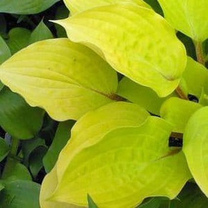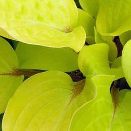These small hostas have a very striking appearance! Hosta Fire Island, Hosta ‘Fire Island’, extends into the base of the leaves for a wonderful contrast. In the summer, the foliage darkens to chartreuse.