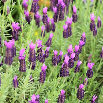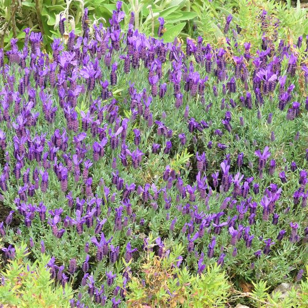 French Lavender is a highly fragrant evergreen shrub. It has strappy gray-green grass-like foliage that grows into a mound that is 2-3 foot tall and wide. It is covered in purple flower spikes that are the classic cut-flower. Use the flowers fresh in bouquets or dried in sachets. They can be used in the kitchen for everything from salads and infusions to teas and ice-creams. Try them in the bath in soap or lotions.
