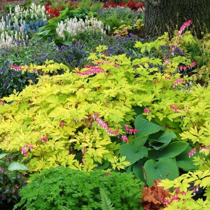 The blooms look wonderful against its bright gold foliage. Bleeding Heart’s should be planted in partial sun to partial shade but will also do well in full shade.
