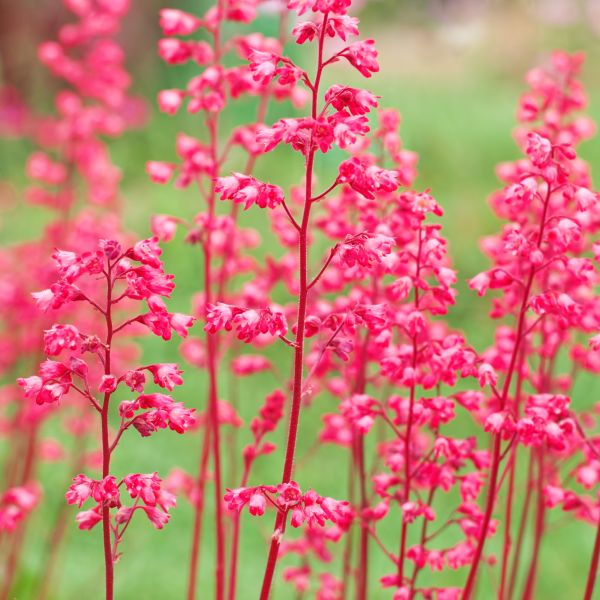 Heuchera Havana (Coral Bell), Heuchera ‘Havana’, displays dense wands of dark pink flowers and has lime green leaves that are veiled in a mist of white!