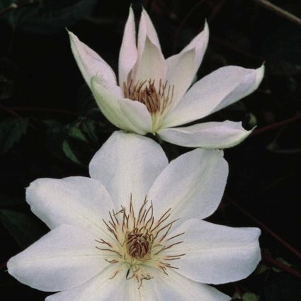 The Clematis ‘Henryi’ has white flowers with chocolate brown anthers that bloom in June and September. It grows to a height of 10′-12’ and a spread of 3’.