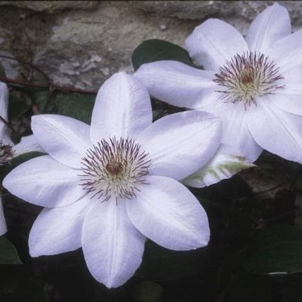 The white flowers are approximately 6-8” wide. Clematis ‘Henryi’ was a winner of the Royal Horticultural Society’s Award of Garden Merit and one can see why! The foliage is dark green and makes a great contrast with the flower color.