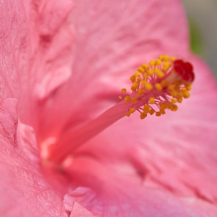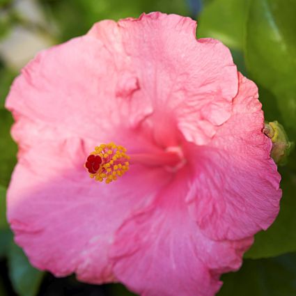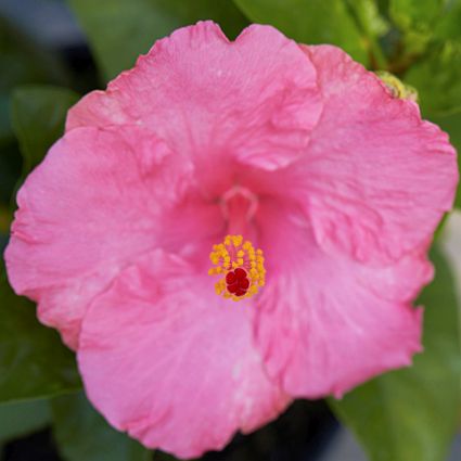 ‘Jolly Polly’, from the Hollywood Hibiscus collection, Hibiscus rosa-sinensis HOLLYWOOD™ ‘5179’, is a hard-to-photograph shade of flamingo pink. Not a soft pink, a pastel pink or even a hot-pink, but a riotous, ruffled, feathery concoction of rich, intense pink that makes you want to break out the sunglasses to take a closer look.
