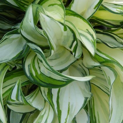 The creamy white leaves of ‘Fireworks’ are very narrow and have a two-tone green margin that streak around the edges. Hosta ‘Fireworks’ is perfect for the smaller garden. The very pretty light lavender flowers appear on 12 inch scapes in midsummer.