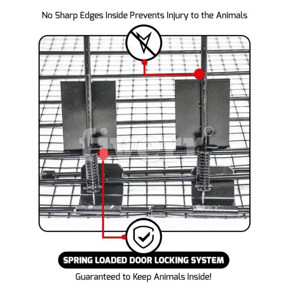The gravity action door with two spring loaded latches allows for fail proof capture. The trap also features a handle to easily transport animals.