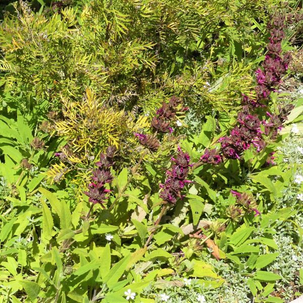 This herbaceous perennial can be massed in dry or used in perennial and mixed shrub borders. A member of the mint family, this place will happily grow to cover ground for you.