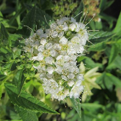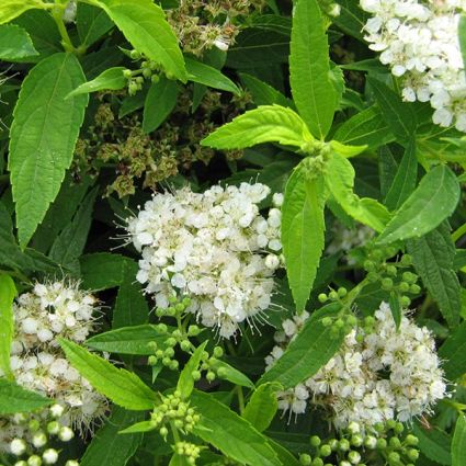 Japanese White is covered with flat clusters of white flowers in June, and again off and on all summer, especially if the old flowers are deadheaded.