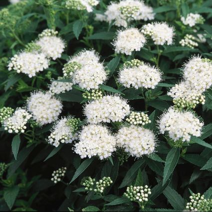 Spireas grow in sun or partial shade and are great in shrub groupings, near buildings, and low hedges. They make great foundation plantings or fill that empty spot in your garden with a burst of white foamy bloom all summer.