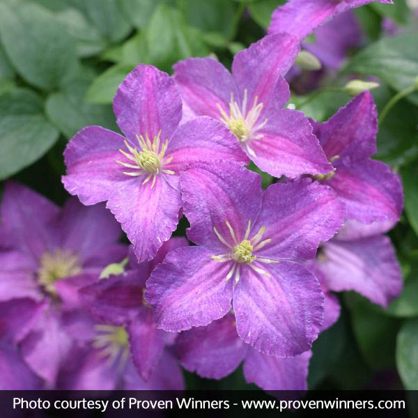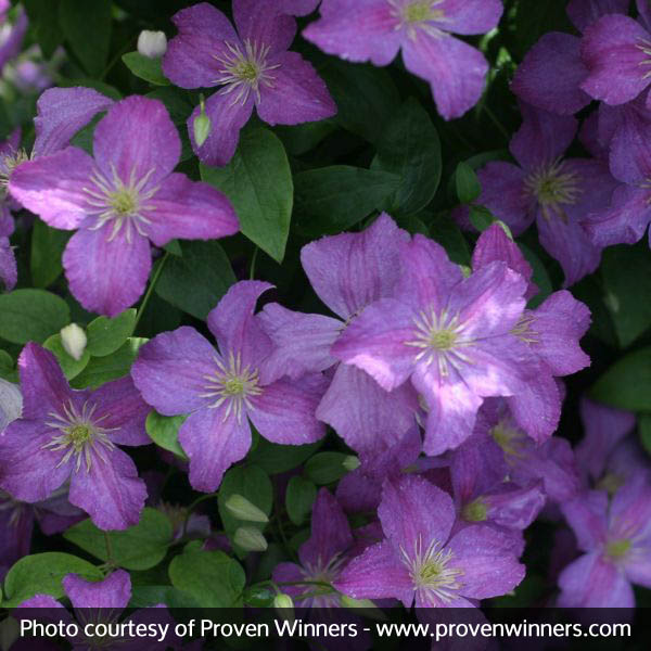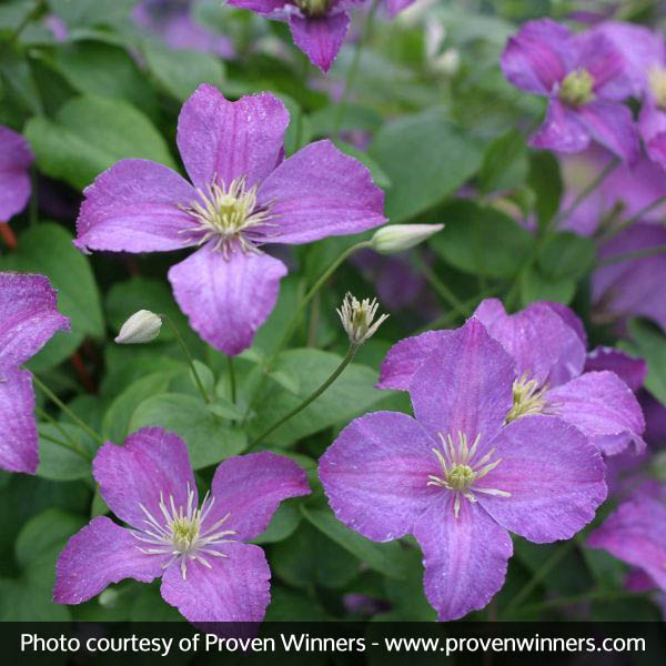 Jolly Good Clematis puts on a “jolly good” show, and keeps the fun coming all summer long! The display begins in spring as green leaves and vigorous growth combine to create a vibrant, climbing vine. By late spring/early summer, 3-inch blooms appear with their lavender petals highlighted with deeper streaks of purple, and accented with adorable white stamens.
