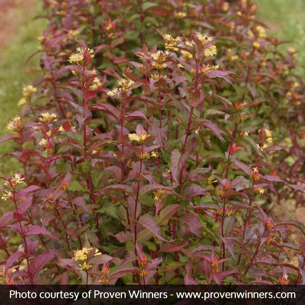 New growth emerges deep burgundy in spring, and transitions to dark green with a red edge. As the season progresses, clusters of delicate, pale yellow flowers appear.