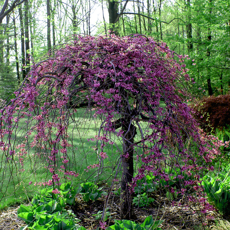 The impact is accentuated by the weeping, twisted branches tipping towards the ground. This tiny tree explodes in the spring with electric lavender flower clusters cascading along the bare, weeping branches in early spring.