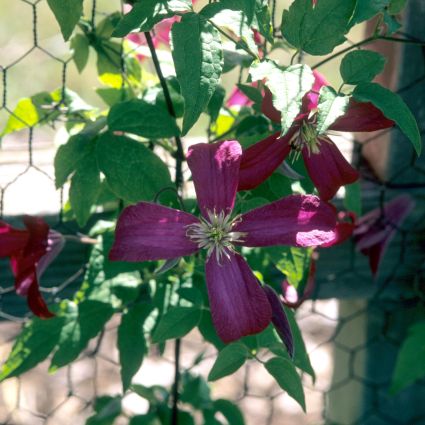 Clematis Madame Julia Correvon needs a supporting structure to grow properly but will also grow over large shrubs, over walls, cover stumps, and make perfect cover ups for unsightly service areas.