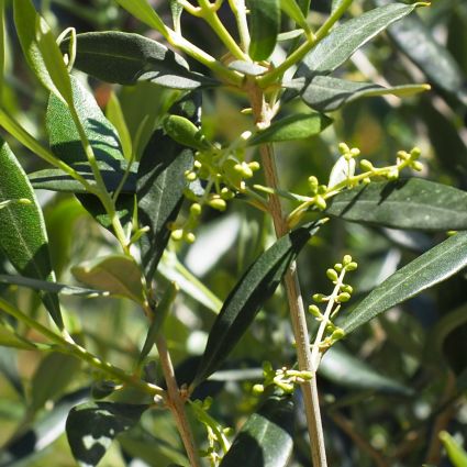 The Manzanillo Olive produces clusters of small, simple, charming white flowers in the summertime. At the height of its bloom, this tree looks frosted with blossoms.