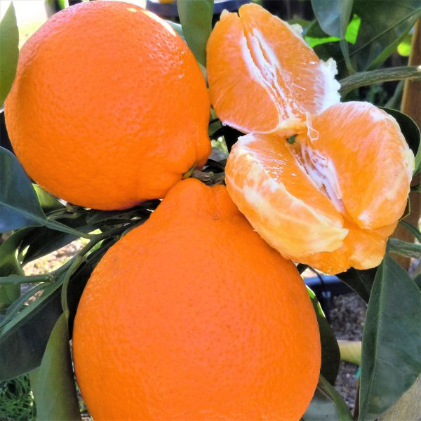 The Minneola Tangelo is a hit with adults and children. The brilliantly colored fruit against glossy dark green leaves is irresistible. Juicy, easy to peel and very few seeds make it a perfect snacking orange.