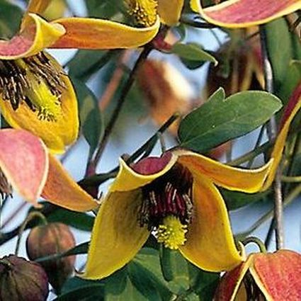 Clematis My Angel, Clematis ‘Engelina’, presents a new color within the Clematis assortment! My Angel Clematis is a hardy woody climber with purple stems and a multitude of 1 1/2 inch flowers, nodding, inside yellow outside red-purple, with creamy colored edged petals. The seed heads are white and numerous.