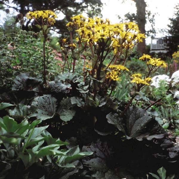 The Ligularia ‘Othello Leopard Plant’, Ligularia dentata ‘Othello’, is a wonderful yellow-orange, daisy-like flower with huge leathery, toothed, heart-shaped, basal leaves. New leaves emerge purplish-red but turn to brownish-green. Blooming from July to August, ‘Ligularia Othello’ has a plant height of 2’ and a spread of 24-36”.