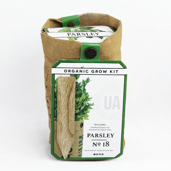 The Urban Agriculture Parsley Kit is so easy to grow. The kit includes everything: a pack of organic parsley seeds, a bag of organic soil, a plant marker tag and a recycled tea bag container with a cute modern urban design.