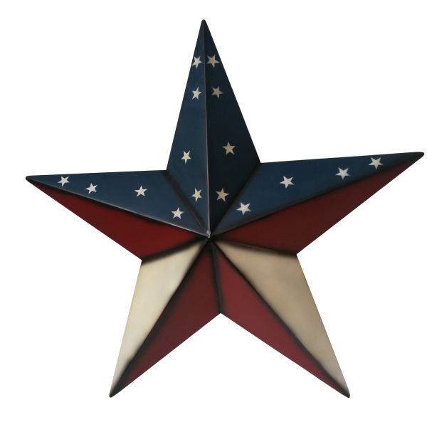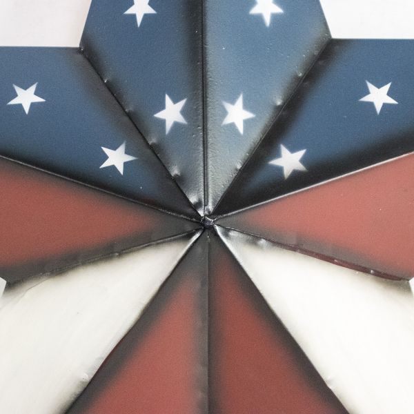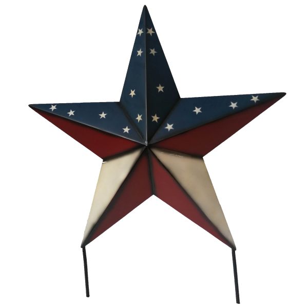 Show your patriotic spirit with this Patriotic star with ground stakes. This metal art features a rustic barn star wrapped in a ribbon of stars and stripes and encircled by a twisted rope design. This patriotic piece is the perfect decoration to display for holidays or year round.
