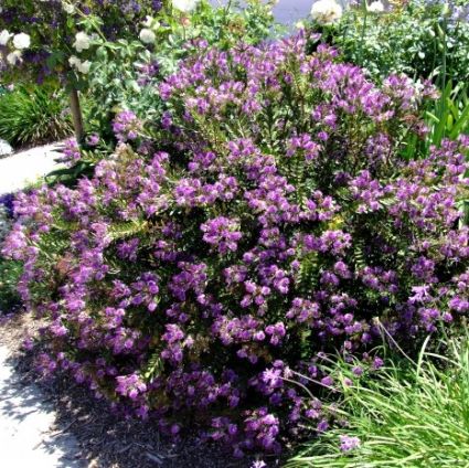 If you live in a warm winter area Zone 8 -11 and want to try a spunky hedge, give ‘Patty’s Purple’ Hebe a try!