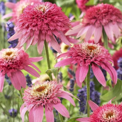 The Echinacea ‘Pink Double Delight’, Echinacea purpurea, has a shorter, more compact habit than most coneflowers. A profusion of bright bubblegum pink, pompon-like, double flowers are produced on strong, well-branched stems from midsummer through early fall!