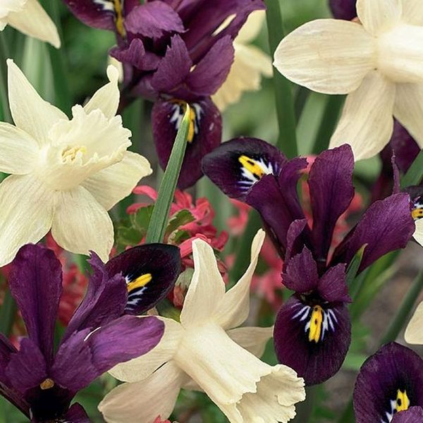This blend is made up of Snow Baby daffodils (Narcissus ‘Snow Baby’) and Purple Hill Iris (Iris reticulata ‘Purple Hill’). The light and dark contrast for a stunning show.