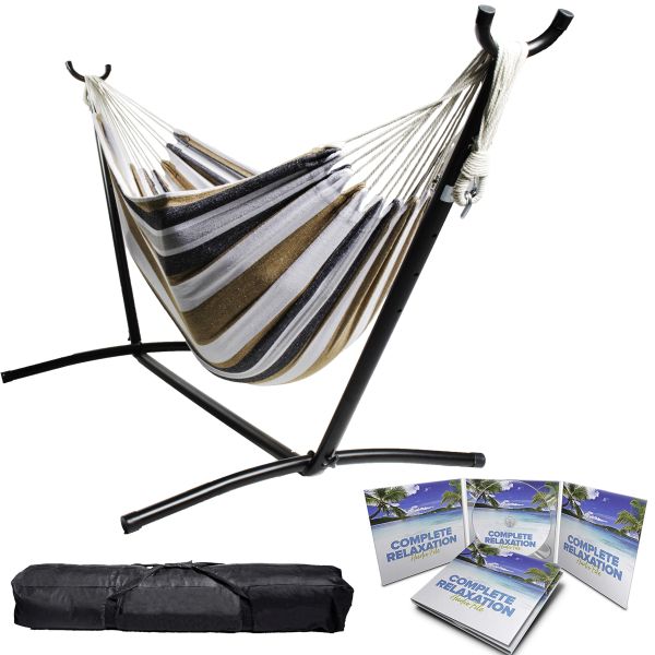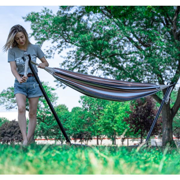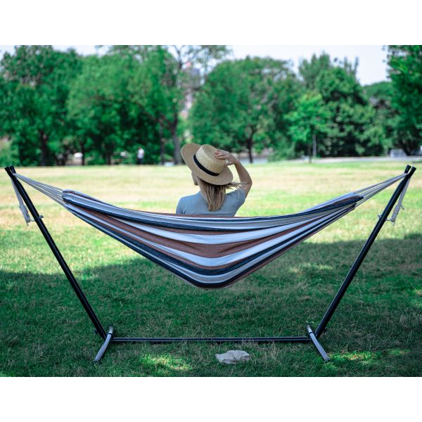Portable Two Person Grey Tan White Pattern Outdoor Hammock With Stand – Garden Center Item