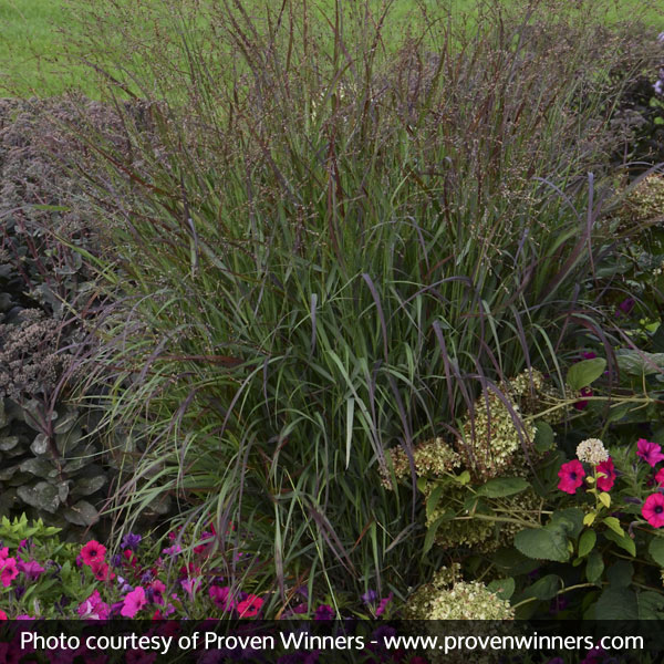 From Proven Winners, ‘Cheyenne Sky’ Panicum virgatum USPPAF forms a tight, v-shaped, 3′ clump of blue-green foliage that turns wine red in early summer. By late summer, the plant is almost totally saturated in color and forms wine red flower clusters.