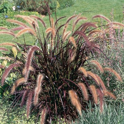 Purple Fountain Grass cascades into a fountain-like shape upon maturity, giving rise to its name. In summer, the tall stems of Purple Fountain Grass soar above its foliage, reaching up, and tipping its foot-long matching burgundy plumes. As the days go by, these plums form an arch and turn a tan color that persists into the early days of autumn.