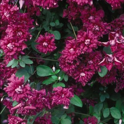 Clematis Purpurea Plena Elegans, Clematis viticella ‘Purpurea Plena Elegans’, has double reddish-purple 3″ flowers that bloom profusely throughout the season.