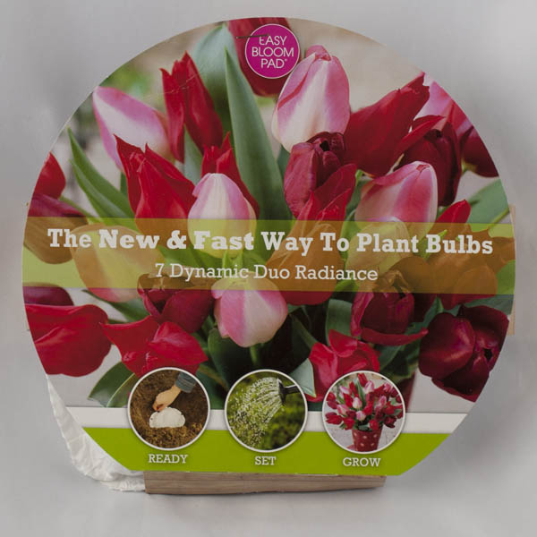 Radiance Bloom Pads have 7 top-grade tulip bulbs already color-mixed by a professional designer and spaced for perfect gardens every time. The bulbs come nestled in a biodegradable cloth that just dissolves into the ground once they’re planted. Dig a 6” deep hole wide enough for the pad, put it in and cover it up with soil. Once you give it a little water, you’re all set!