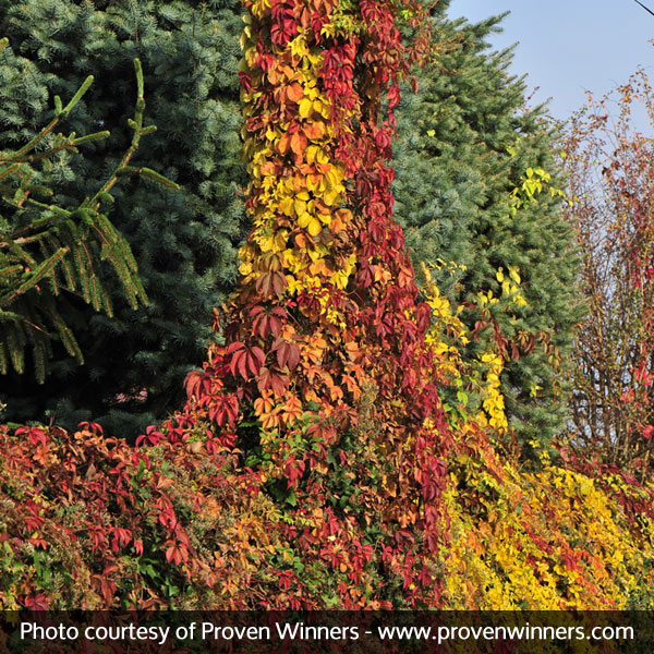 The bright-green leaves turn fire-engine red in the fall and are so thick that you will truly have a “red wall” of foliage each year. The leaves drop in winter, but the dark-blue berries remain and are a treat for wildlife into spring when the leaves return in full force.