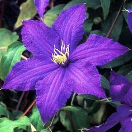 Clematis Rhapsody is an outstanding cultivar with broad, pointed, dark indigo-blue flowers.