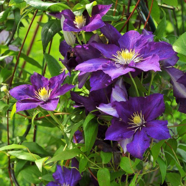 Compact grower; great for containers, balconies and small gardens. Groom the Rhapsody Clematis after flowering by cutting back the top one-third to one-half of some stems. This encourages new growth for possible summer bloom.