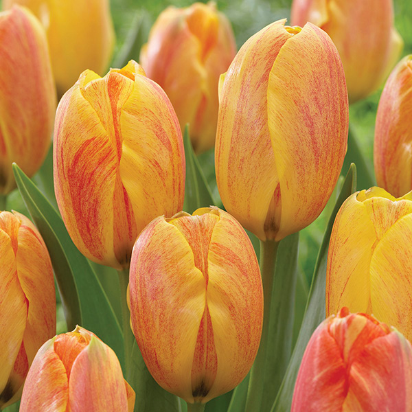 These bright and fun apricot-colored tulips make a lovely single-variety mass planting or grow yours in a cut garden for stunning and joyous bouquets. Because of their shorter-than-most Single-Late’s height, they’re one of the few Single Lates that make a suitable front border.