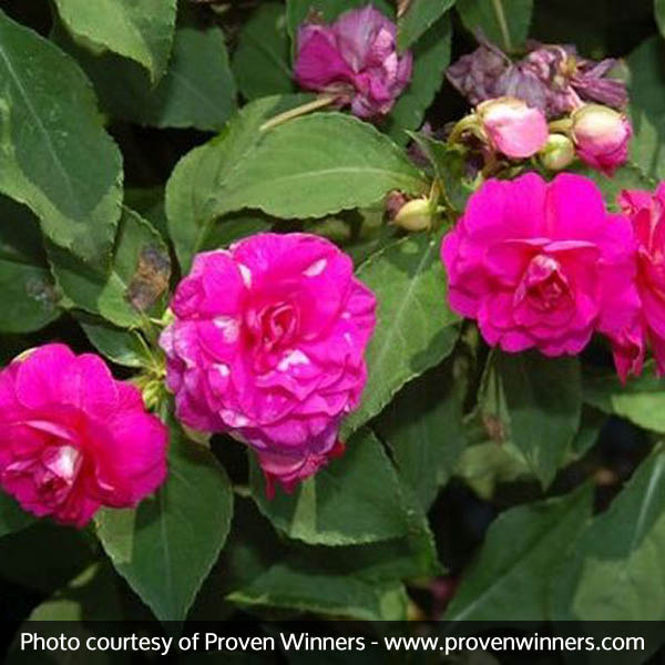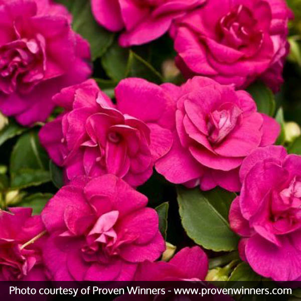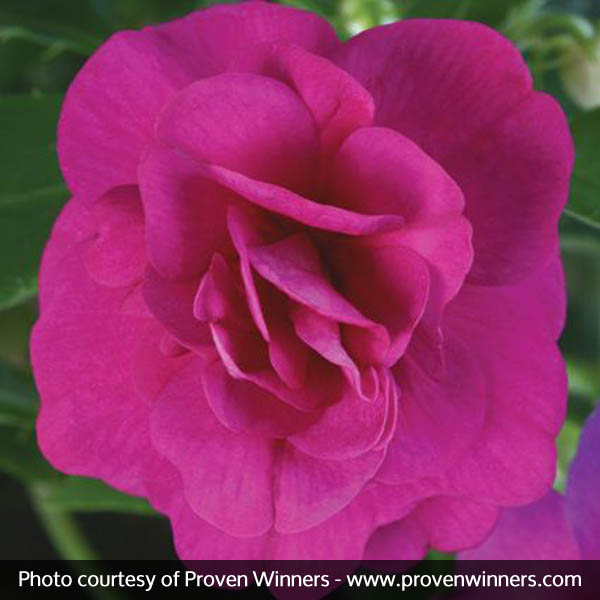 Impatiens Rockapulco Purple, Impatiens walleriana ‘Rockapulco® Purple’, displays miniature rose-like purple blooms that perform great in shady locations.