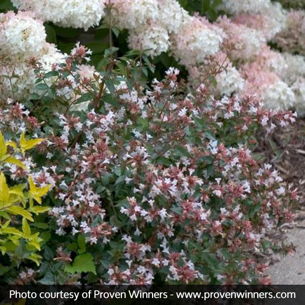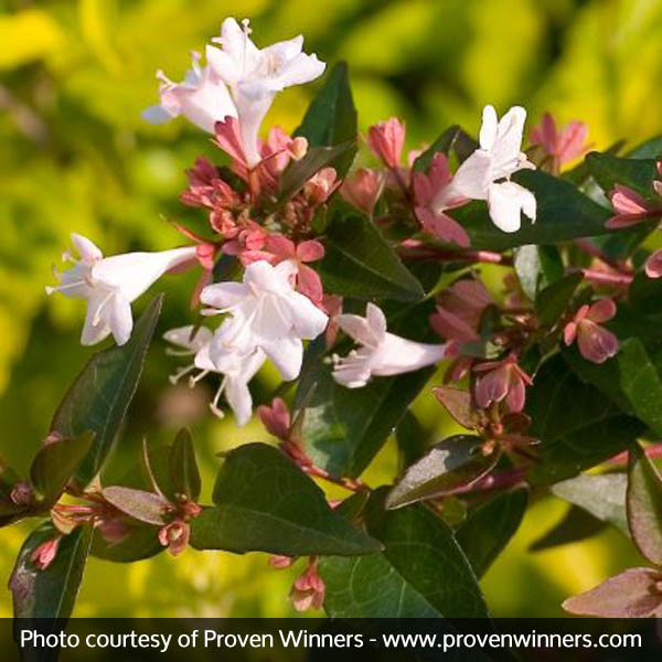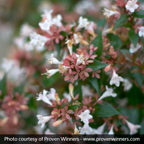 The Abelia ‘Ruby Anniversary’, Abelia chinensis ‘Keiser’, is a dense growing shrub with clean green foliage that emerges with a red tint.Use in the back or middle of a container or for foundations or mixed borders.