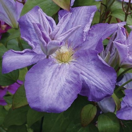 Clematis Silmakivi, Clematis ‘Kivisilm’, is a free flowering cultivar with an abundance of 6 inch flowers that are light blue, with lighter blue, almost white, stripe. Creamy yellow anthers accent the centers. A comforting contrast to darker, richer plants.