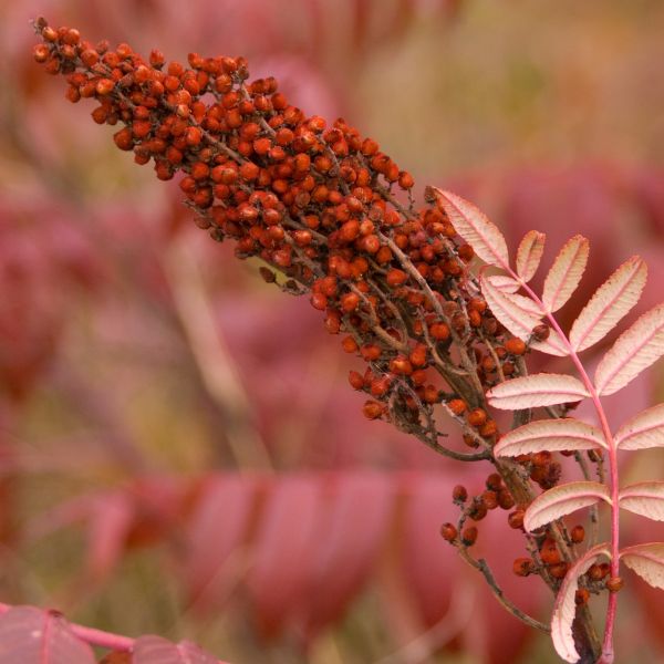 The Smooth Sumac is one of the easiest and hardiest plants to have in your garden. It thrives in dry, well drained, soils and full sun. It’s no wonder the Smooth Sumac is the only shrub to be native to all 48 of the contiguous United States. If you’d like, you can rejuvenate these shrubs by cutting them back to the ground midwinter, however, this is not necessary to maintain a healthy bush.