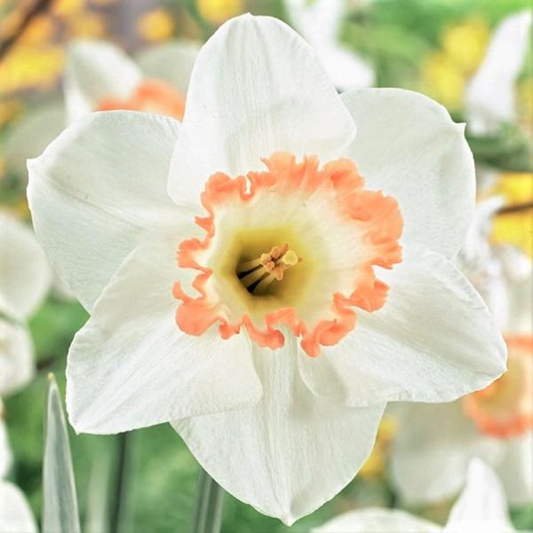 With clean white petals surrounding a large cup of cream fringed in bright orange and one large blossom per strong stem, you’ll want to plant plenty of them. After all, you’ll need armfuls for spring cut flower arrangements. Everyone will want to enjoy them!