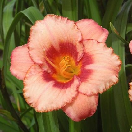 The Hemerocallis ‘Strawberry Candy’, also known as a Daylily, has a wonderful color of a strawberry-pink blend with a rosy-red eye zone, a golden green throat, and ruffled edges.
